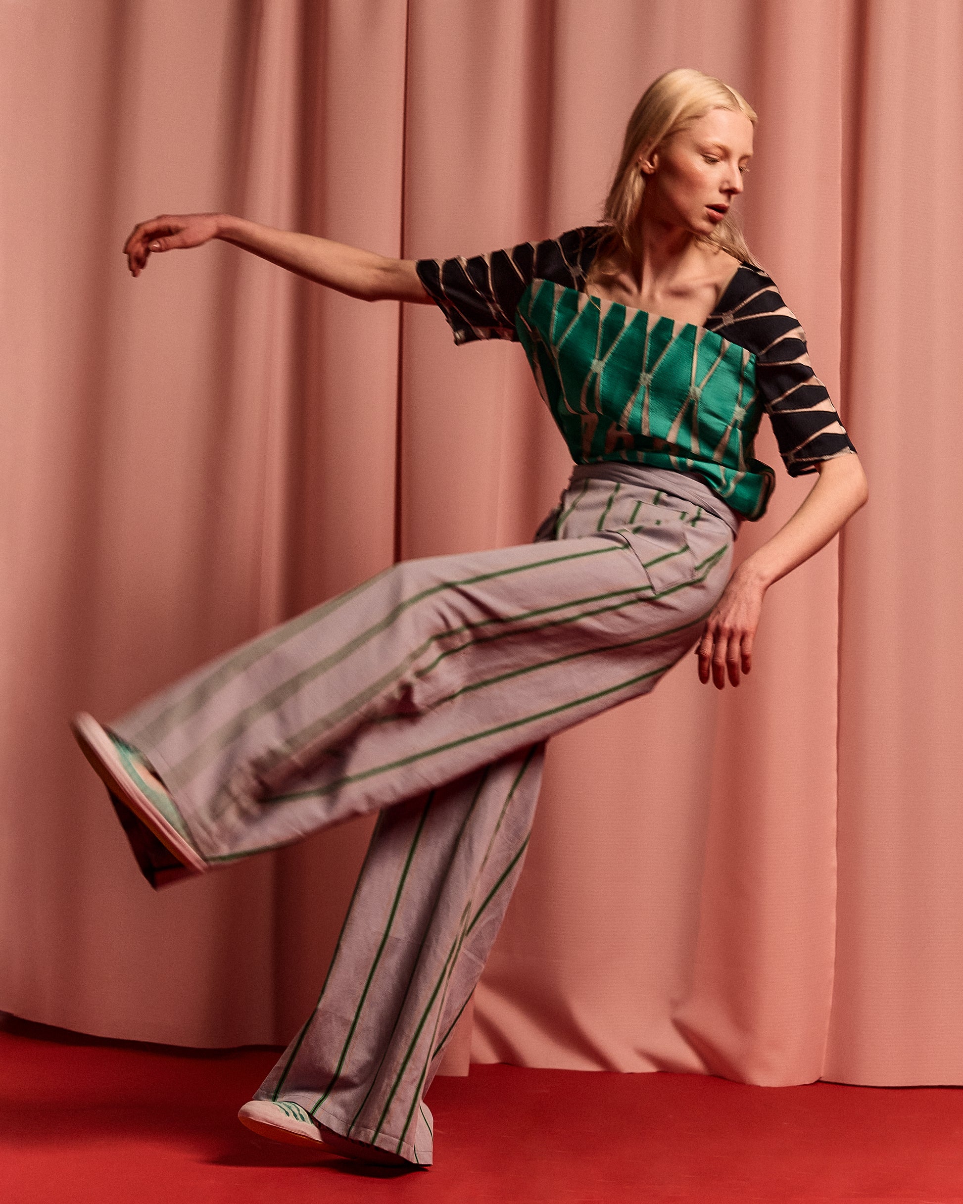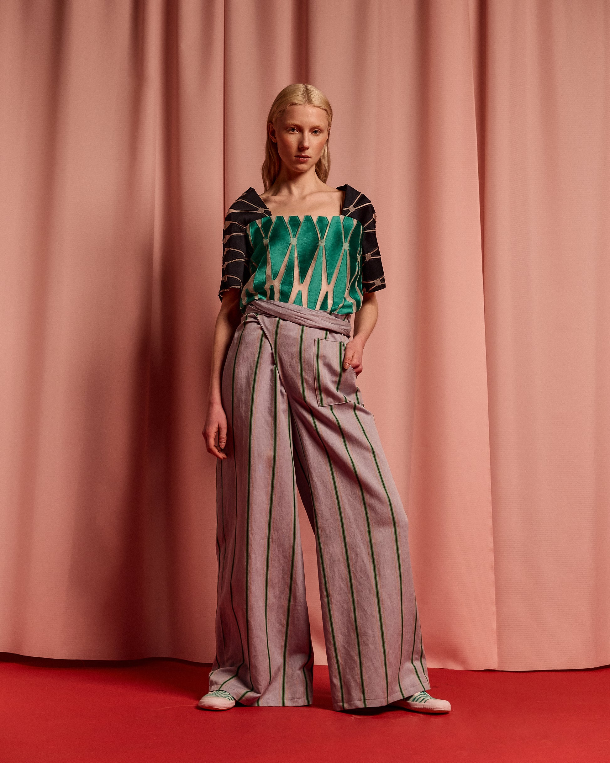 Adjustable striped pants in linen and cotton.